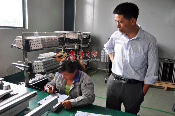 在察看過程中,張社喜時不時地停下腳步,詢問員工的工作情況,碰到員工一時無法解決的問題,他便十分耐心的給員工指導(dǎo)講解,看得出來,張社喜對生產(chǎn)技術(shù)很了解。在貼片車間,張社喜告訴記者,這些加工的設(shè)備都是數(shù)字化程式化的,只需員工在一旁看著就可以,并且設(shè)備速度之快堪比電腦。記者看到機(jī)器飛速的運(yùn)轉(zhuǎn),燈片在機(jī)器飛快運(yùn)轉(zhuǎn)中出來,再由員工進(jìn)行進(jìn)一步的細(xì)化,一位穿著工作服四十歲左右的女員工,手上正十分熟練的對燈片進(jìn)行二次加工。